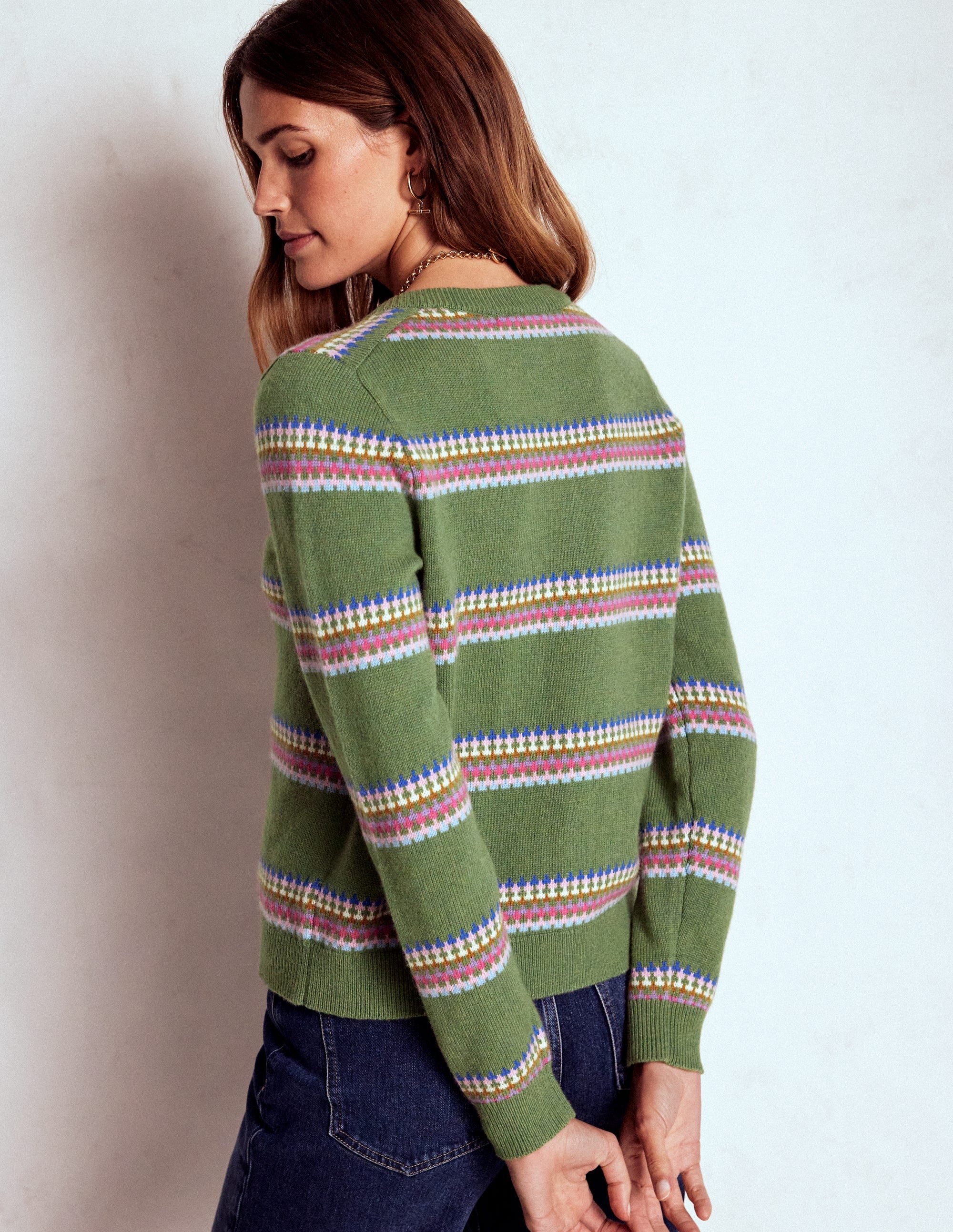 The Edie cardigan is spun from a soft blend of wool and cotton, and features our playful take on the classic Fair Isle pattern.