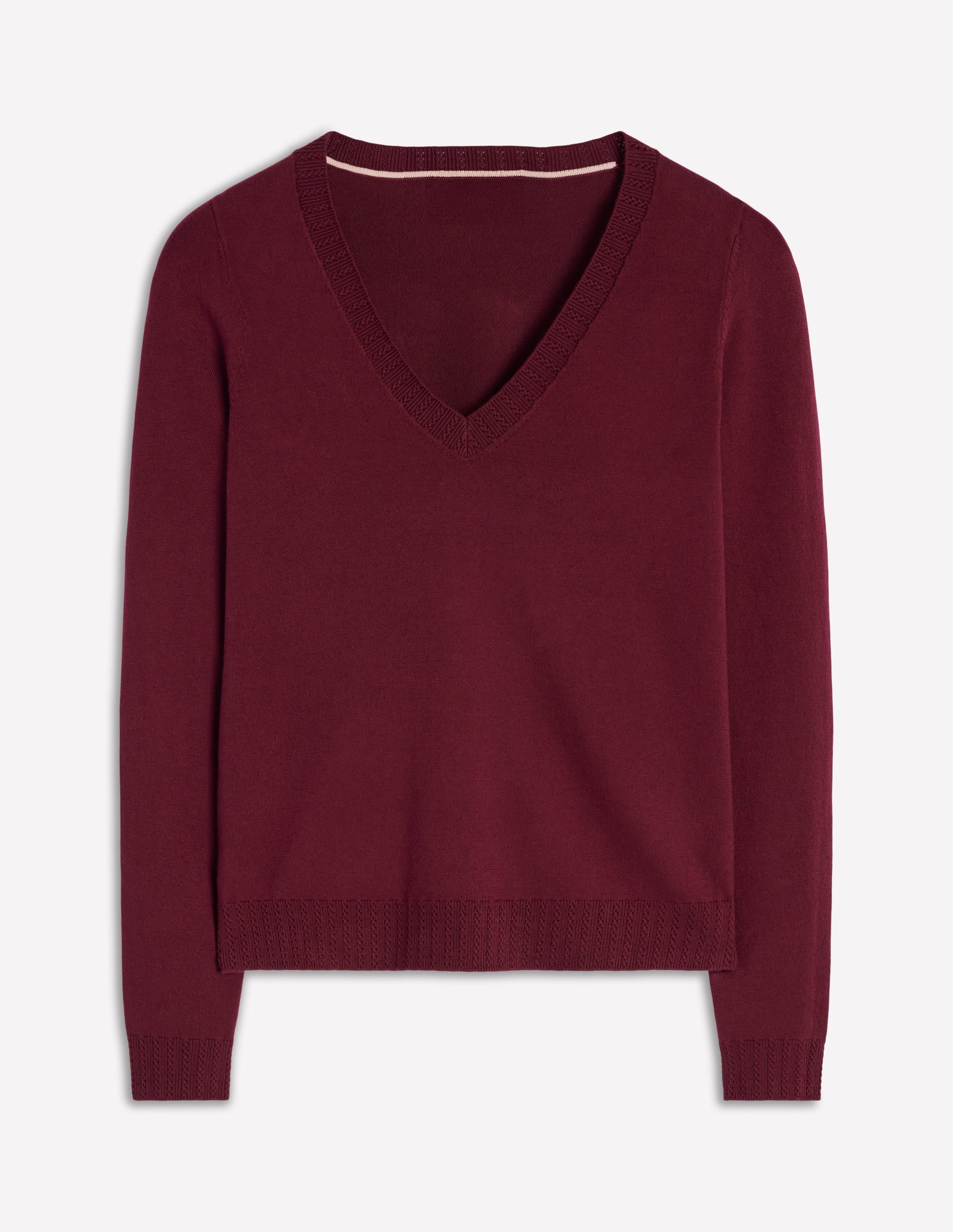 Introducing our Emilia V-neck jumper, complete with intricate knit detailing at the cuffs and neckline. Get one in every colour, we say…