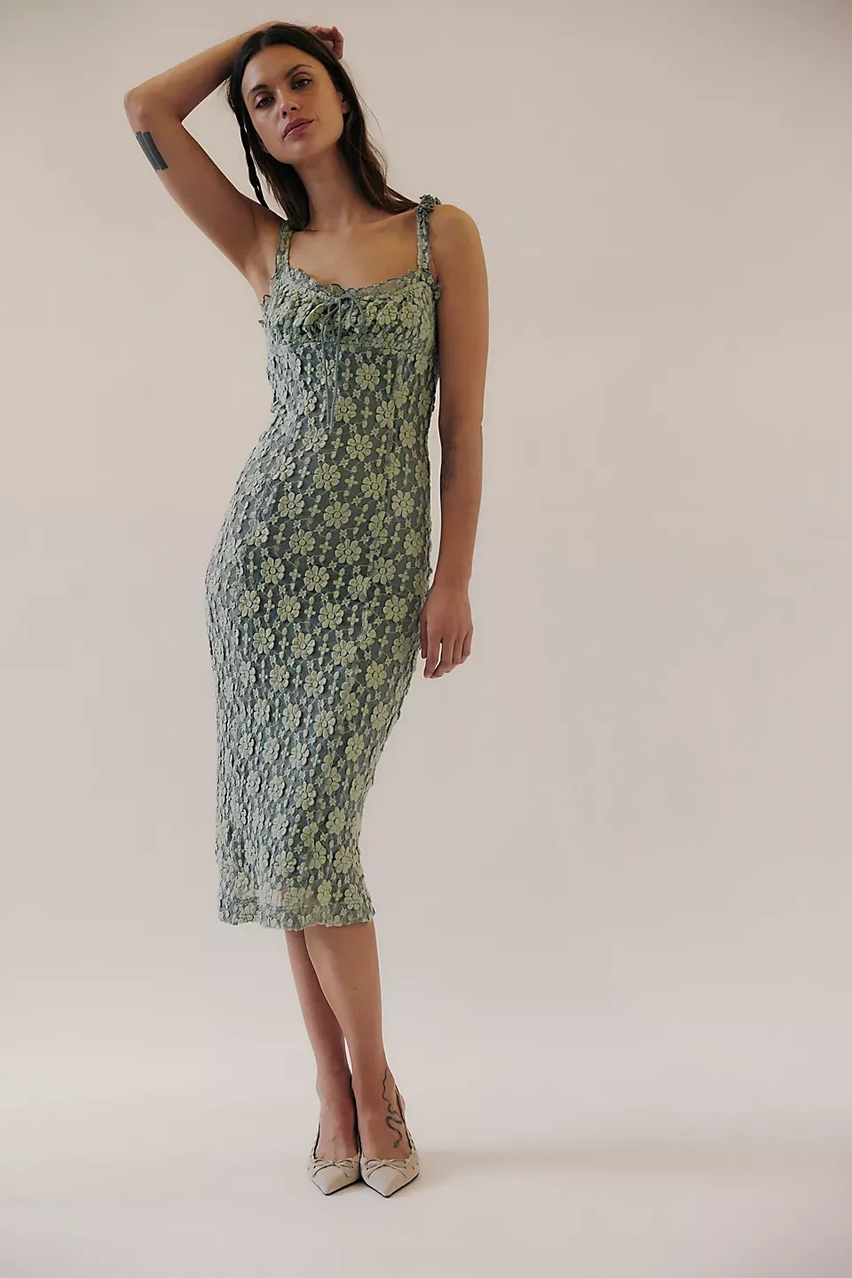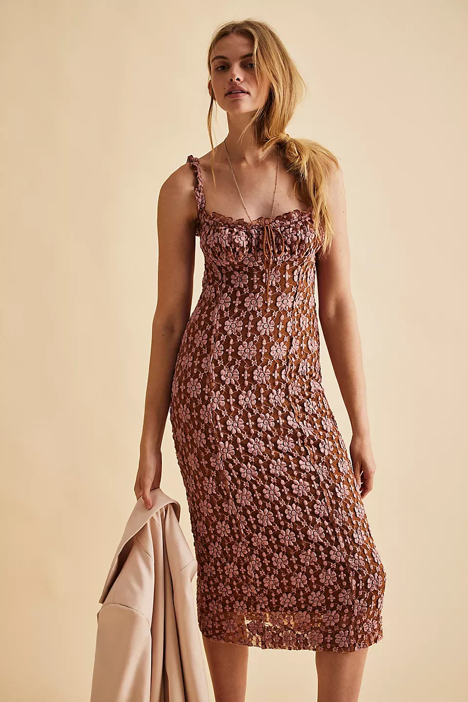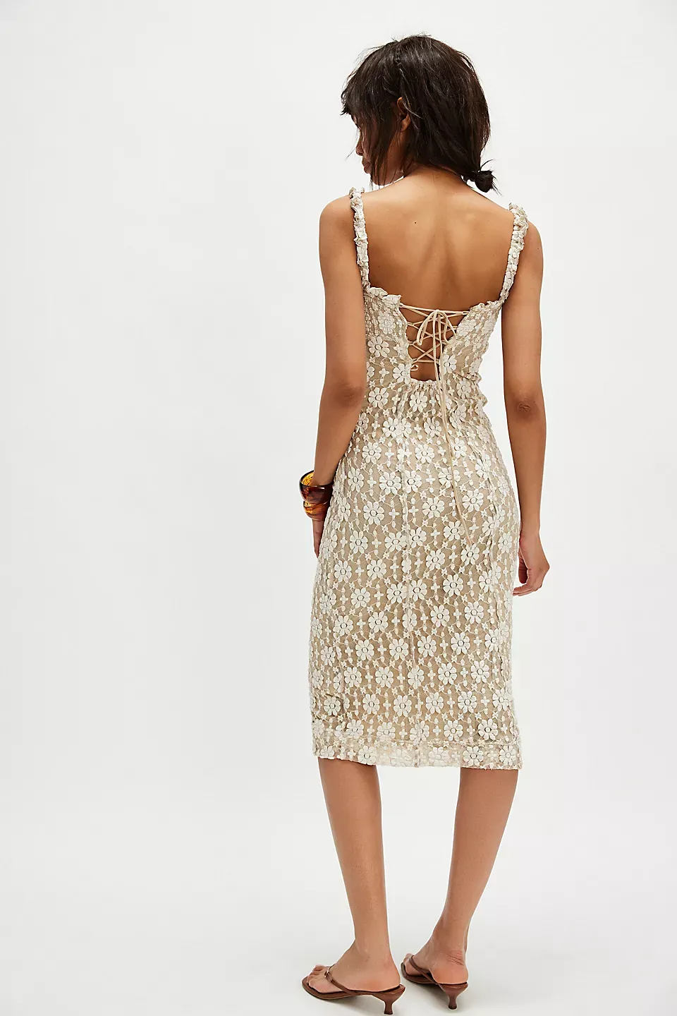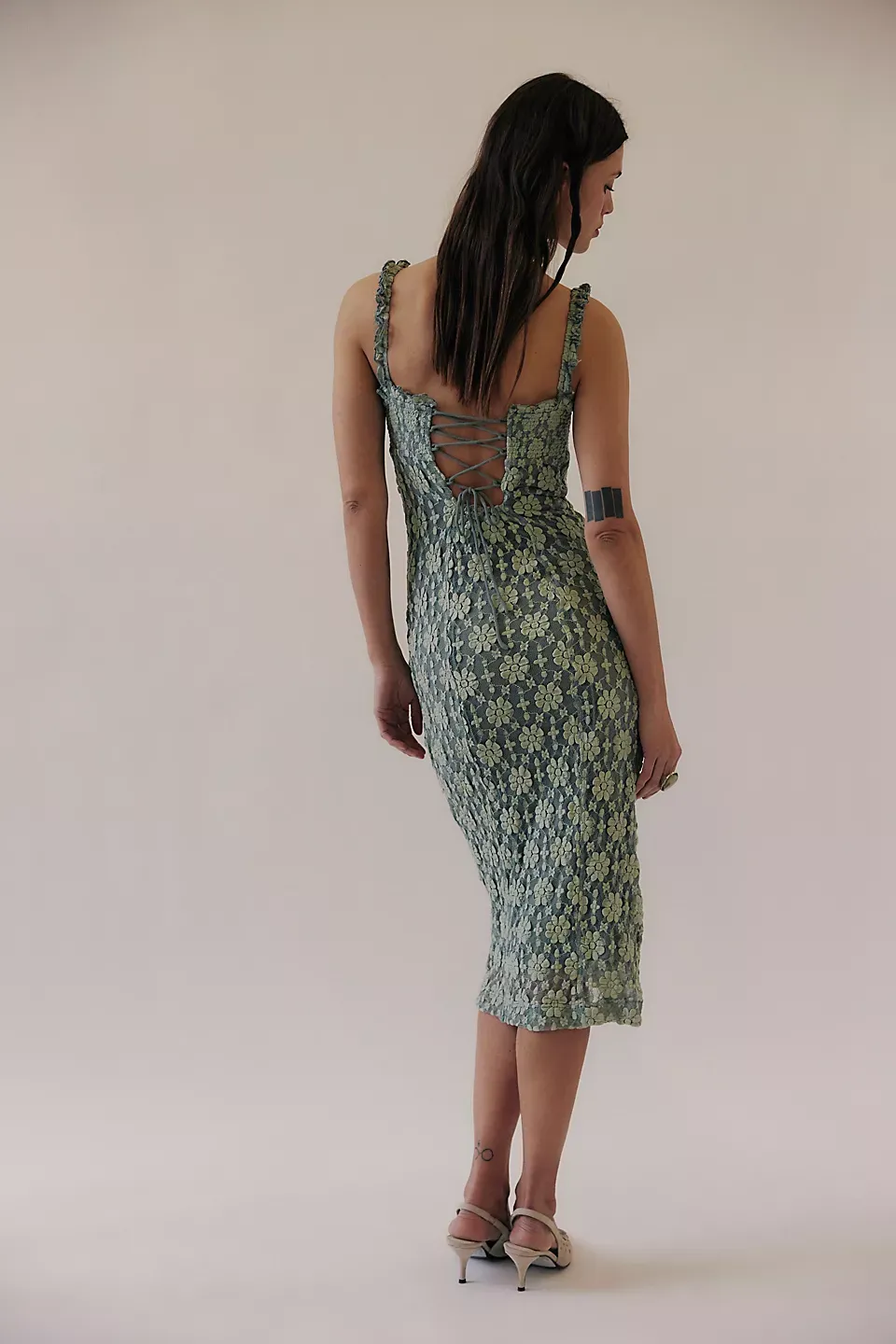 Just as effortless as it is essential, this timeless midi dress is featured in a fitted, pencil-style silhouette with floral lace embroidery throughout and staple square neckline for the perfect femme finishing touch. **Fit:** Classic, fitted style **Features:** Square neckline, pleating at bust, tie feature at chest, lace-up detail at back, ruffed shoulder straps **Why We ? It:** The perfect piece to pair with anything from a strappy kitten heel to a stylish sneaker or sandal.