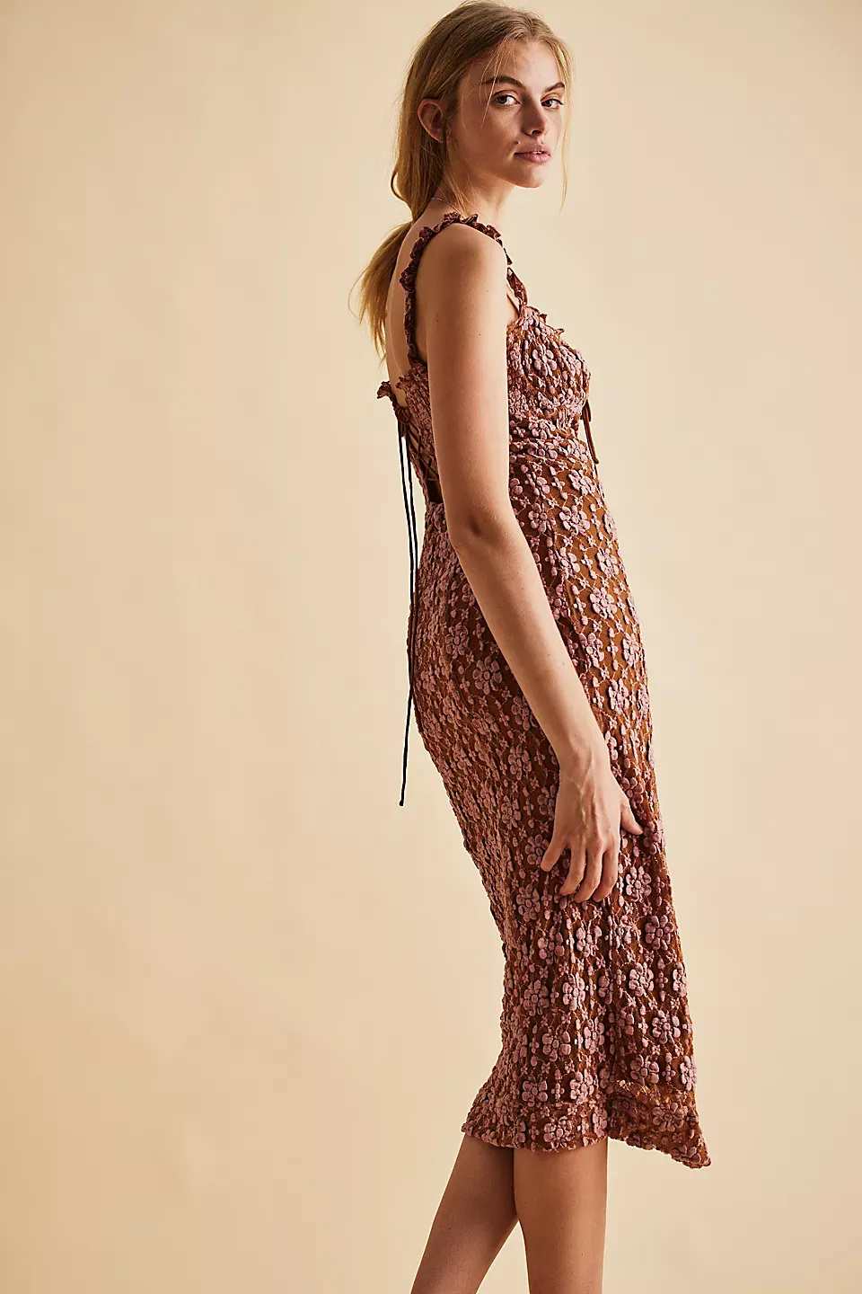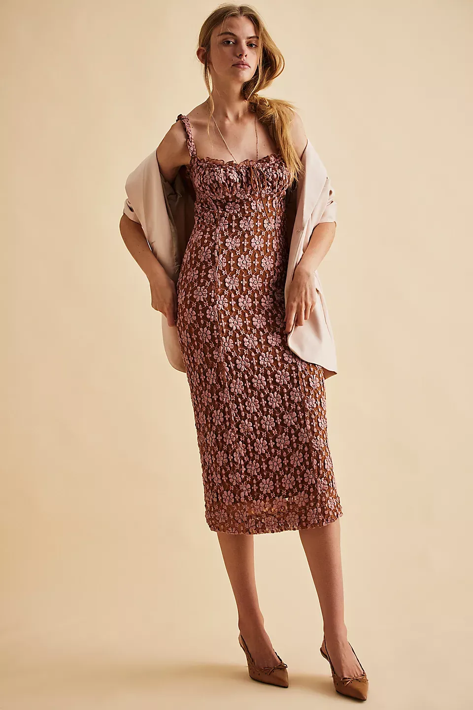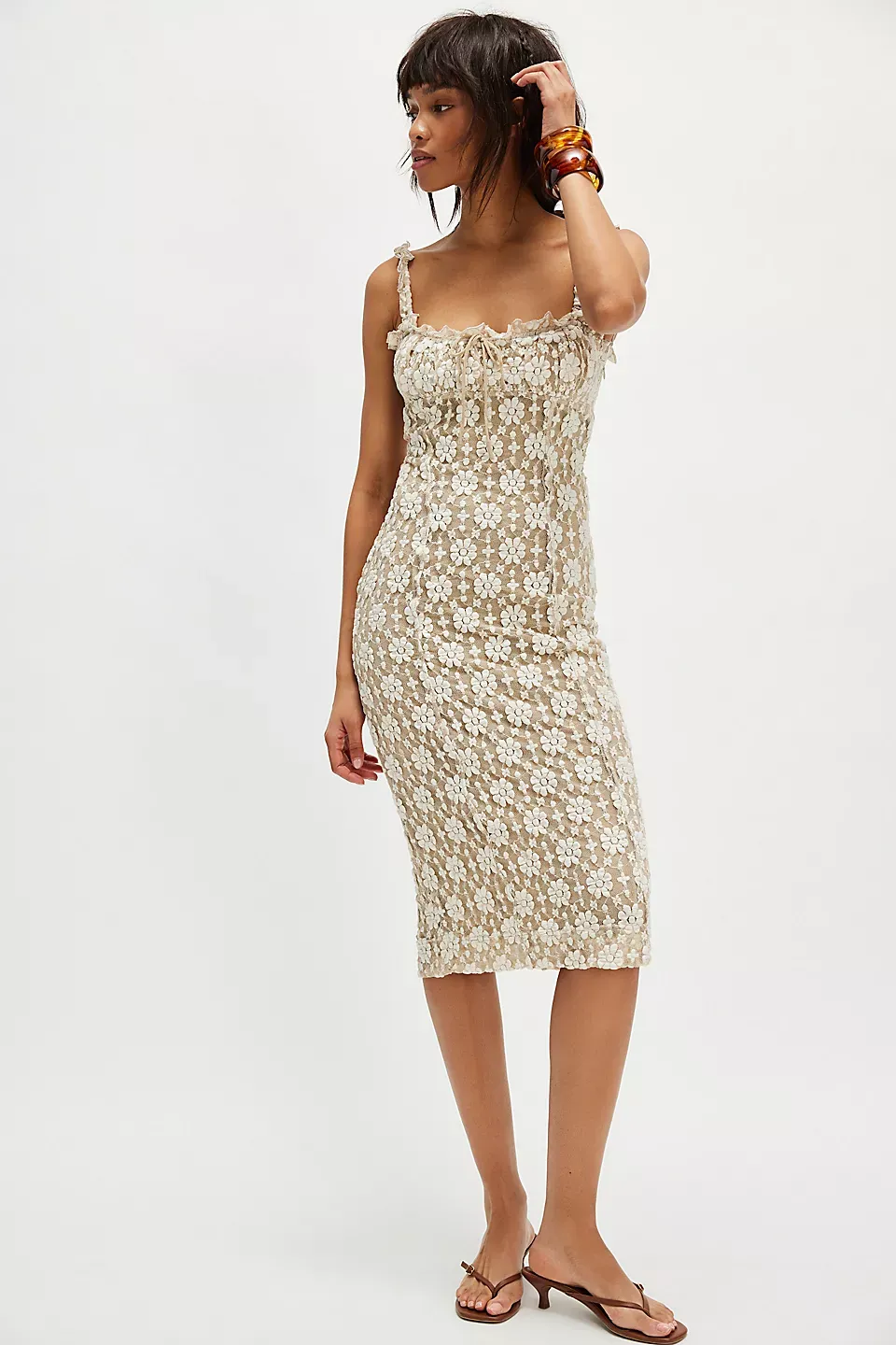Just as effortless as it is essential, this timeless midi dress is featured in a fitted, pencil-style silhouette with floral lace embroidery throughout and staple square neckline for the perfect femme finishing touch. **Fit:** Classic, fitted style **Features:** Square neckline, pleating at bust, tie feature at chest, lace-up detail at back, ruffed shoulder straps **Why We ? It:** The perfect piece to pair with anything from a strappy kitten heel to a stylish sneaker or sandal.