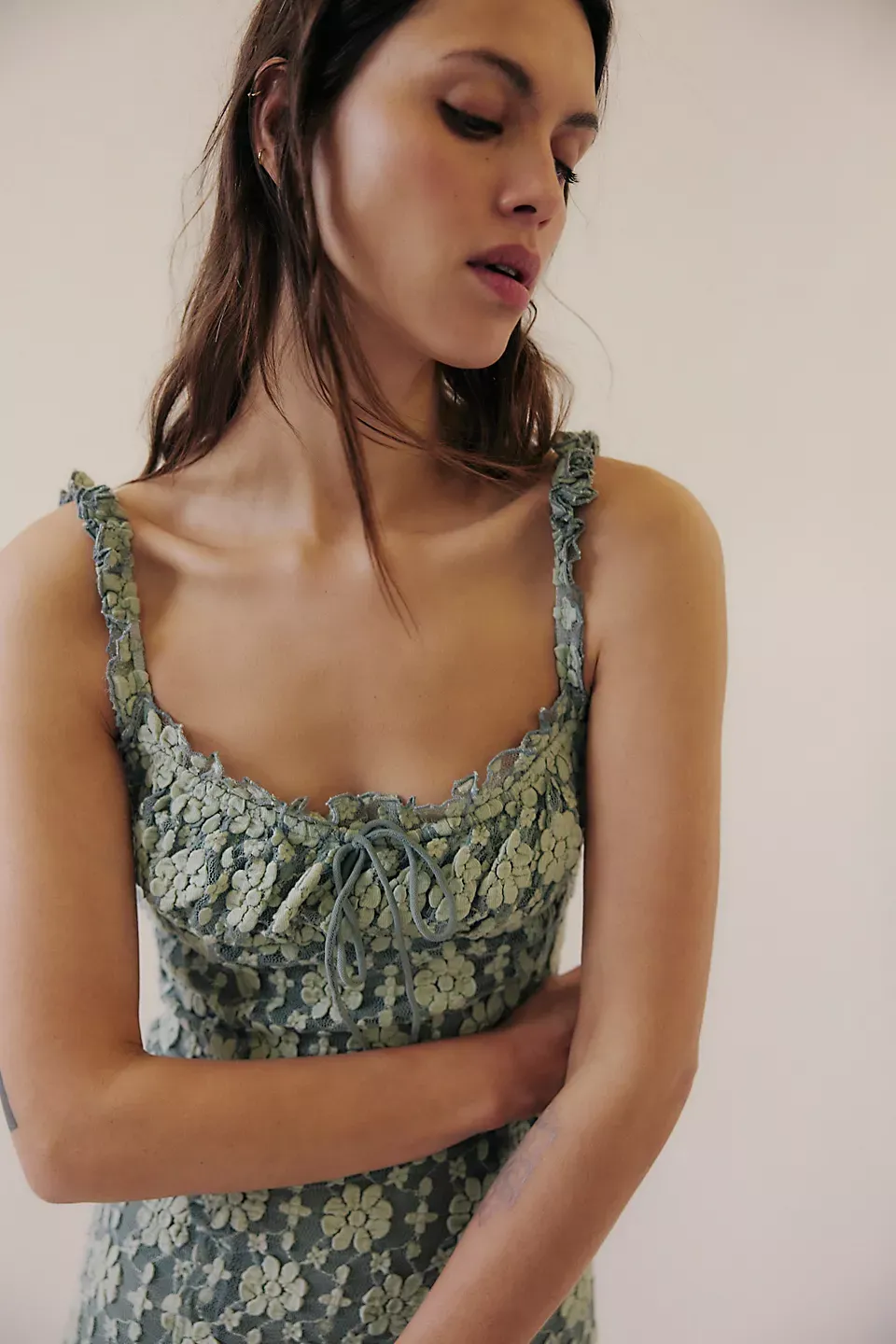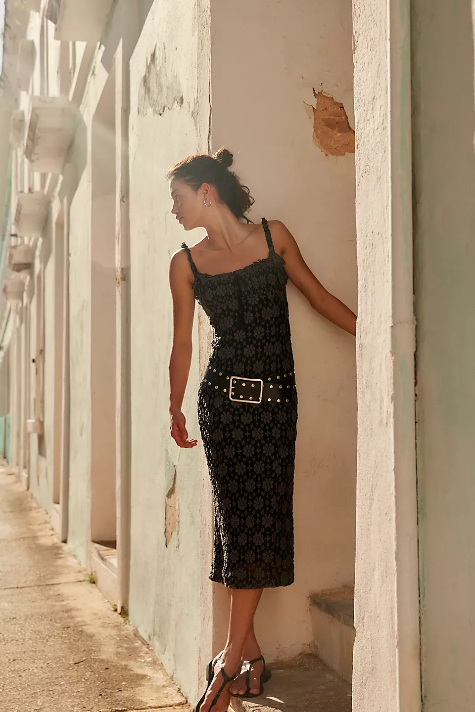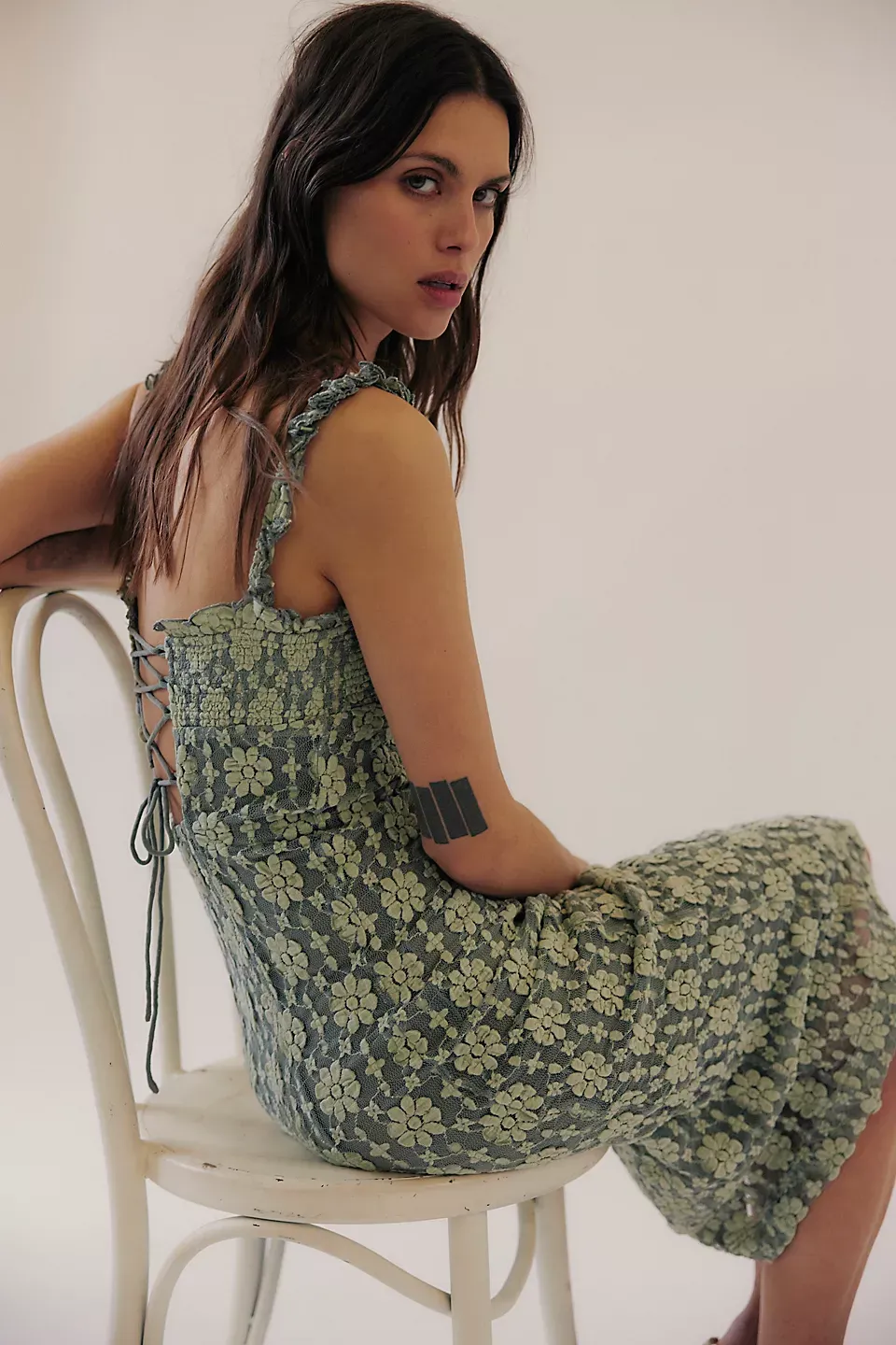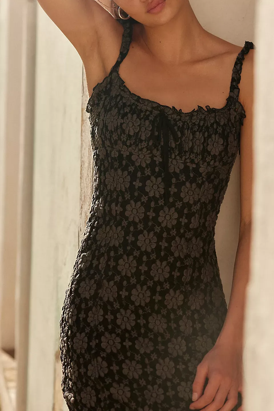 Just as effortless as it is essential, this timeless midi dress is featured in a fitted, pencil-style silhouette with floral lace embroidery throughout and staple square neckline for the perfect femme finishing touch. **Fit:** Classic, fitted style **Features:** Square neckline, pleating at bust, tie feature at chest, lace-up detail at back, ruffed shoulder straps **Why We ? It:** The perfect piece to pair with anything from a strappy kitten heel to a stylish sneaker or sandal.