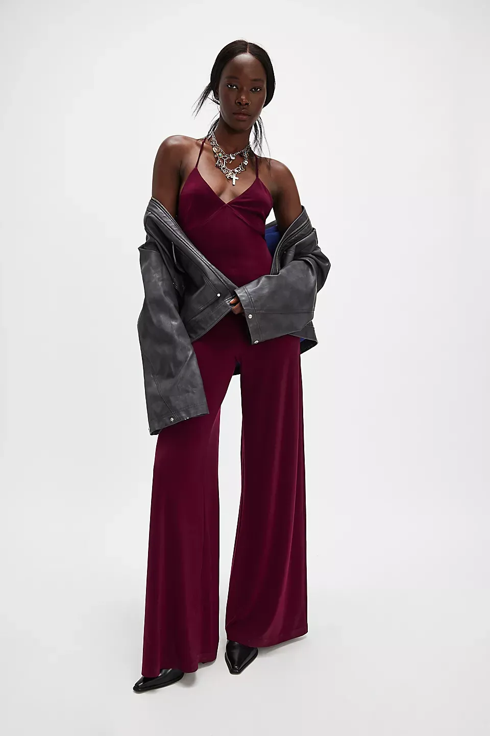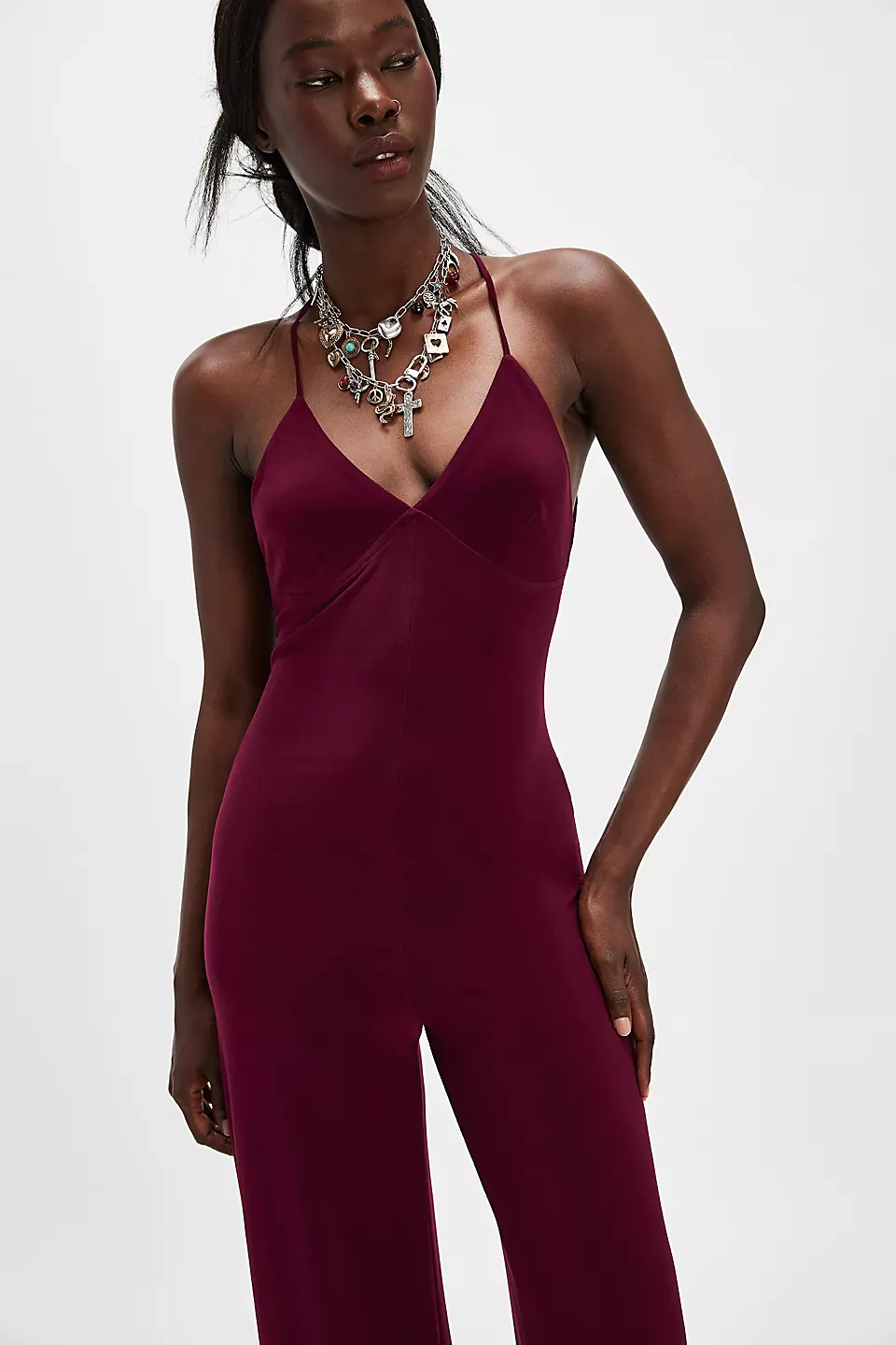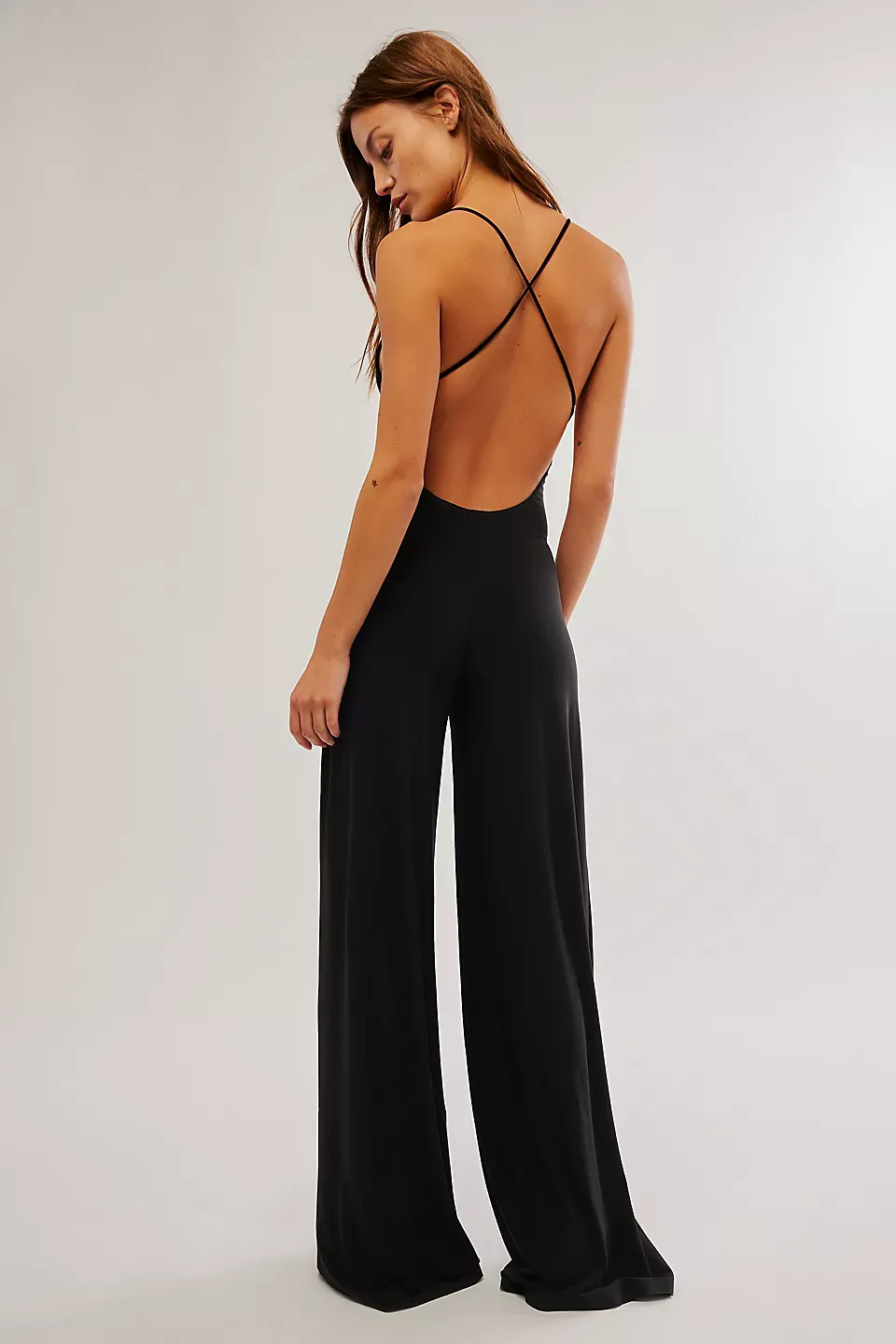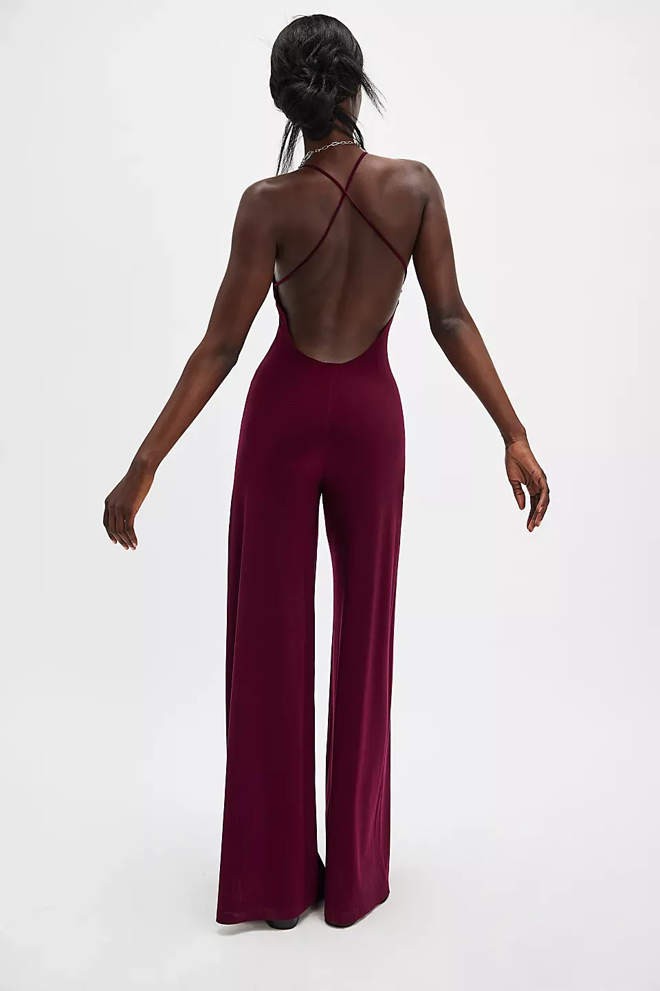 So sleek and forever flattering, this sultry jumpsuit from Norma Kamali will turn heads with every wear.**Fit:** Slim at the bodice with loose leg design **Features:** V-neckline, strappy open back, seamless pull-on fit **Why We ? It:** Effortlessly elevated with strappy heels or off duty with sporty sneakers, this style has endless ways to wear.