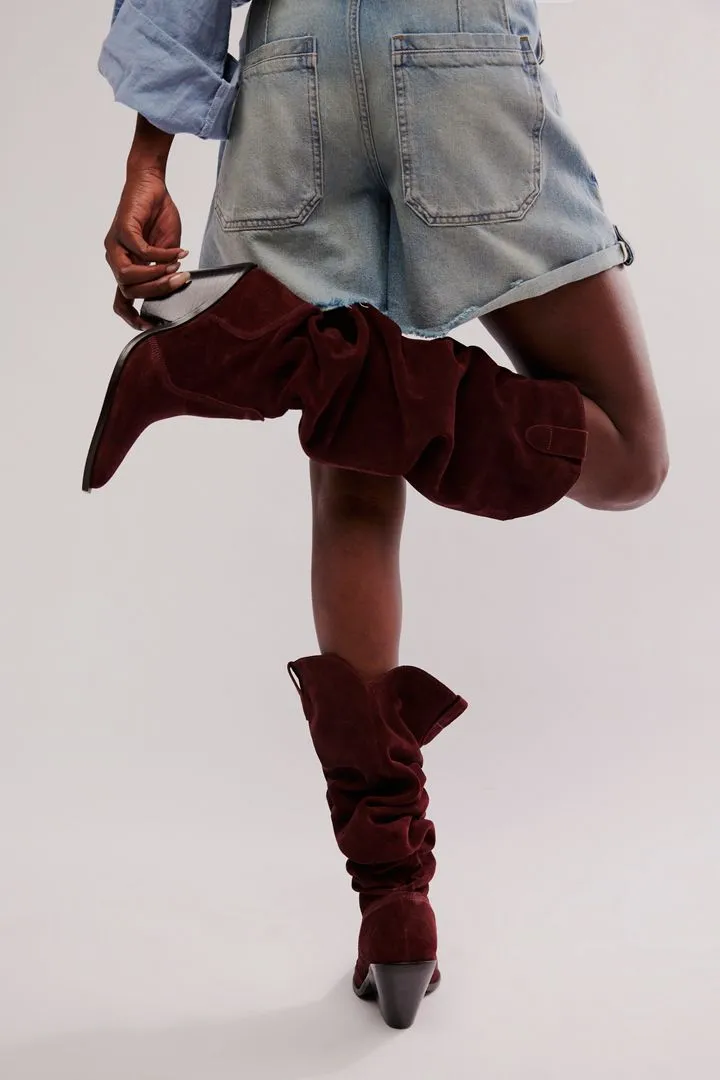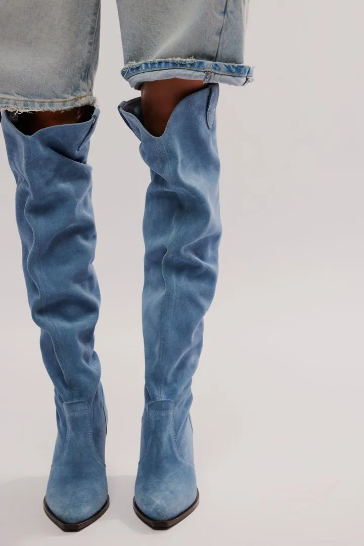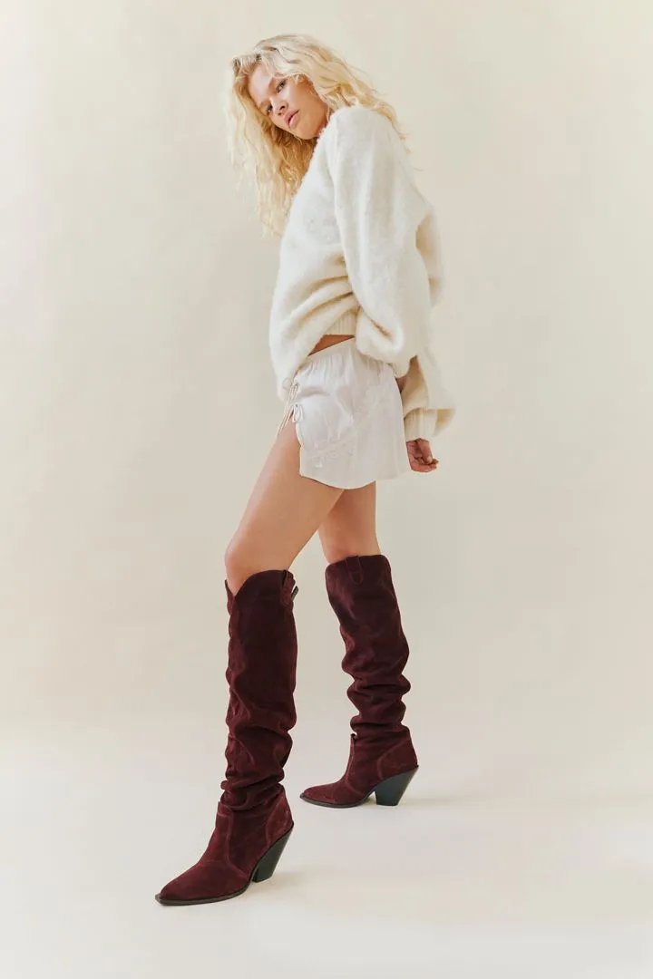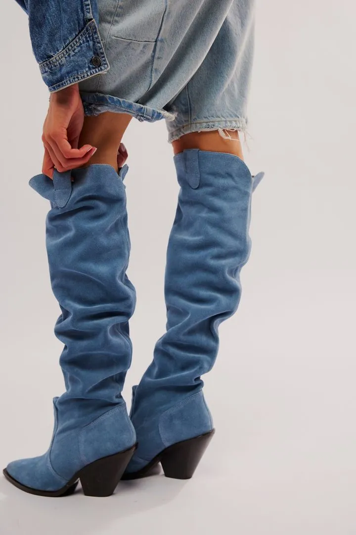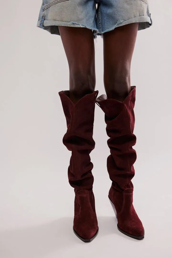 Any way you want them; these slouchy, pointed toe boots are featured in a roomy, over-the-knee style that can be scrunched down or worn full-length for endless look.