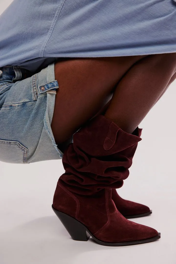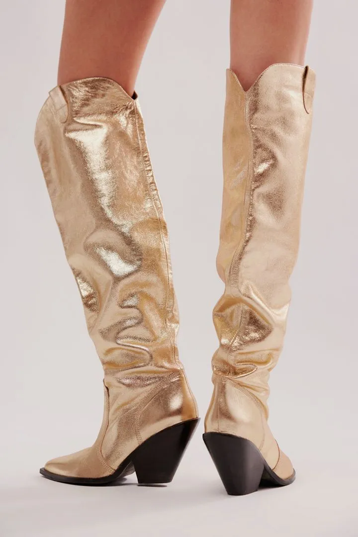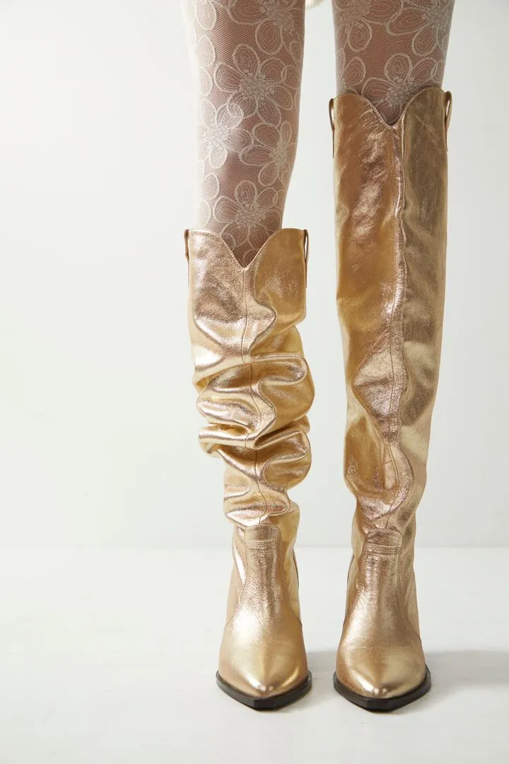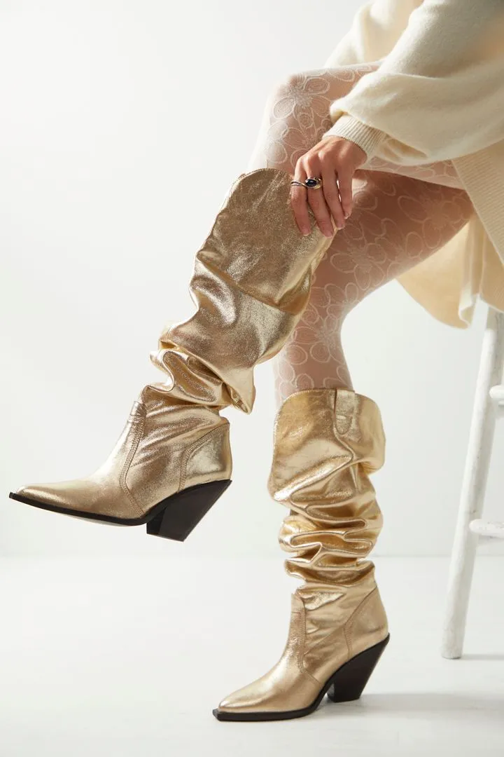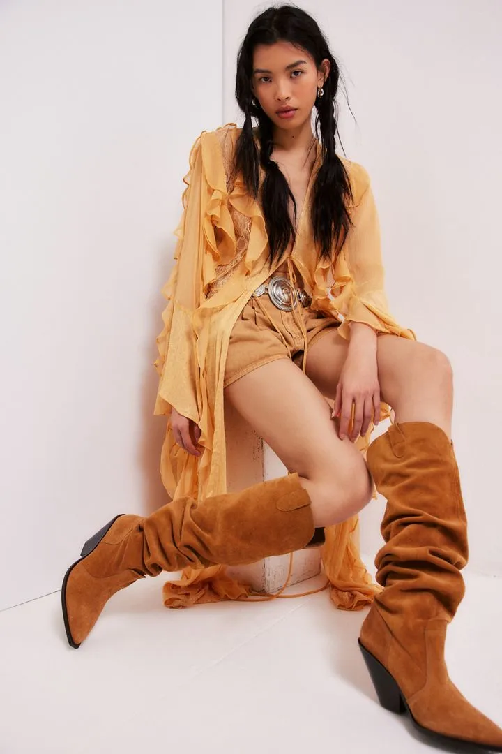 Any way you want them; these slouchy, pointed toe boots are featured in a roomy, over-the-knee style that can be scrunched down or worn full-length for endless look.