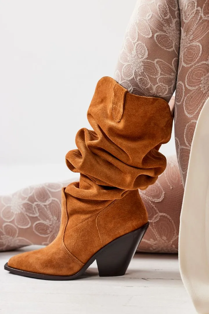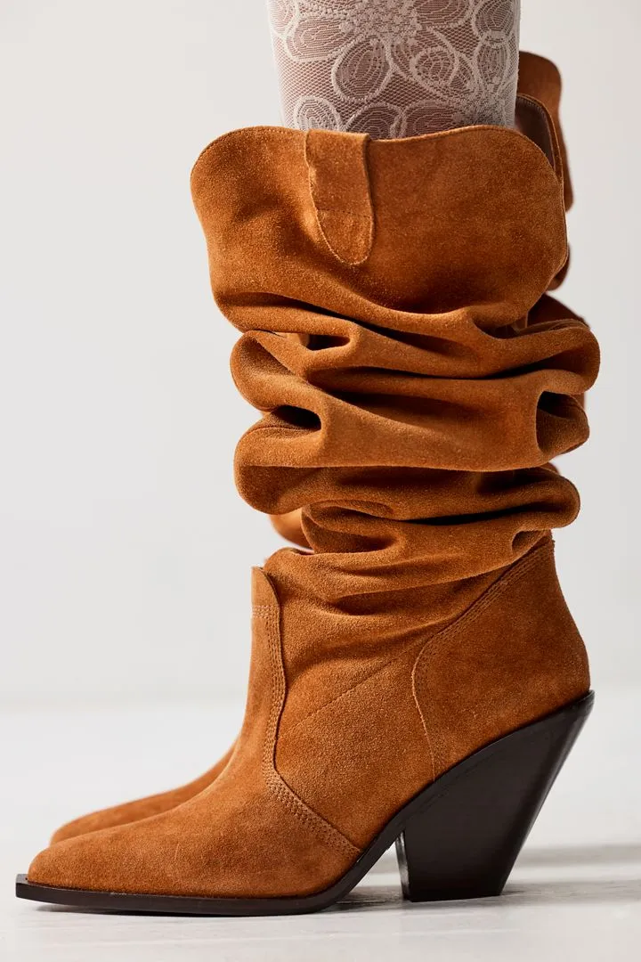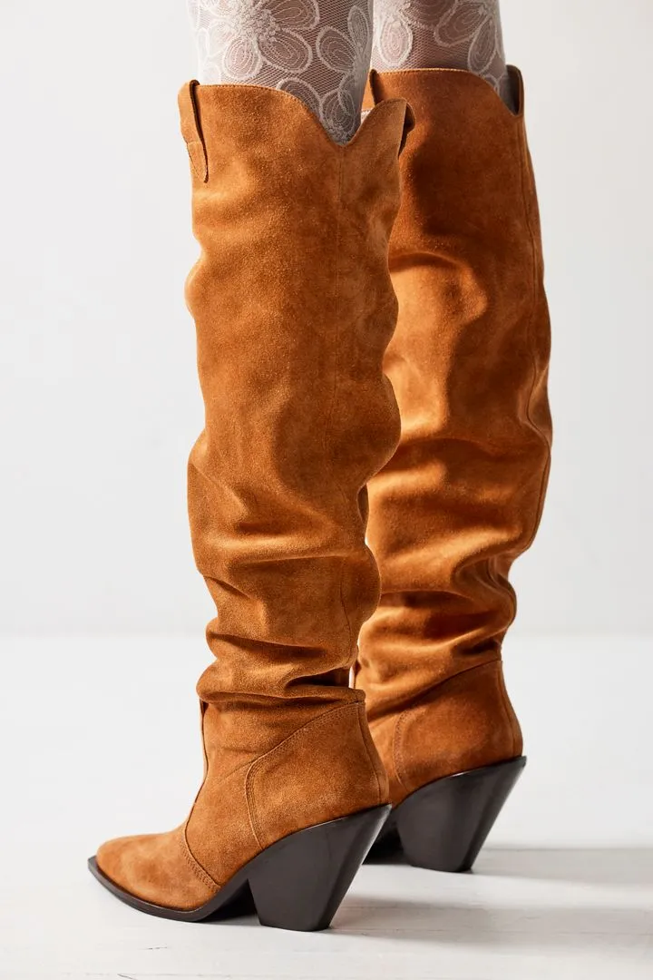 Features: Over-the-knee length, pull-on design, slouchy style, suede fabrication, pointed toe, dipped toplines, pull straps, chunky block heel